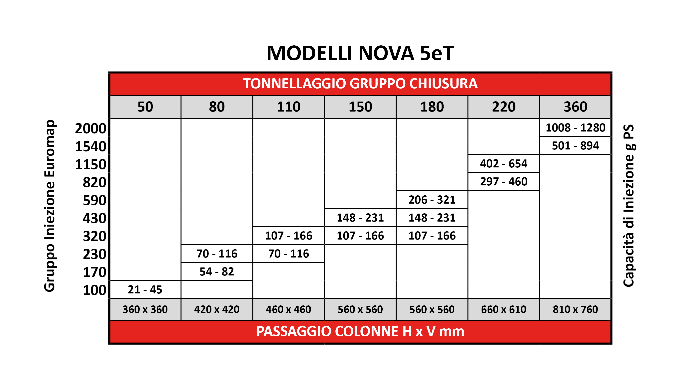 La Nova 5eT rappresenta la quinta generazione di macchine all-electric realizzate per il massimo d’efficienza e di precisione. Il nuovo gruppo di chiusura genera una pressione di contatto uniforme sullo stampo e il gruppo d’iniezione ha un processo di plastificazione di qualità superiore. Il controllo TACT V fornisce un’operabilità eccellente e la solida struttura del bancale assicura stabilità durante lo stampaggio a cicli elevati. Le guide lineari a ricircolo di sfere sulla piastra mobile e il design della piastra senza bronzine garantiscono la pulizia della zona stampi e rendono le presse idonee alla camera bianca. La pressa è dotata di un sistema di lubrificazione automatica a grasso. I movimenti completamente sovrapposti consentono tempi di ciclo ridotti